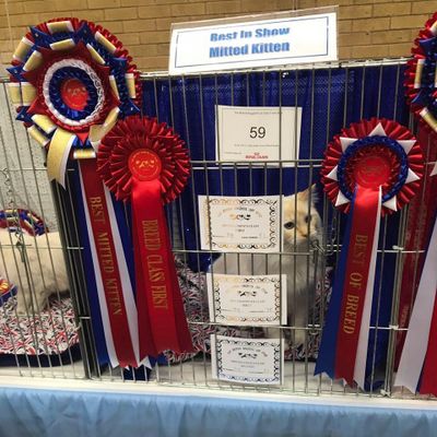 Rupert (pictured left winning Best Of Breed at the 2018 tbrcc show) is a Red Tabby Point Mitted. We take him and our other cats to shows around the Country.